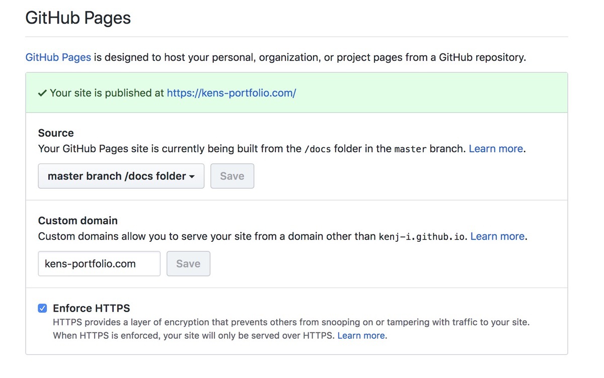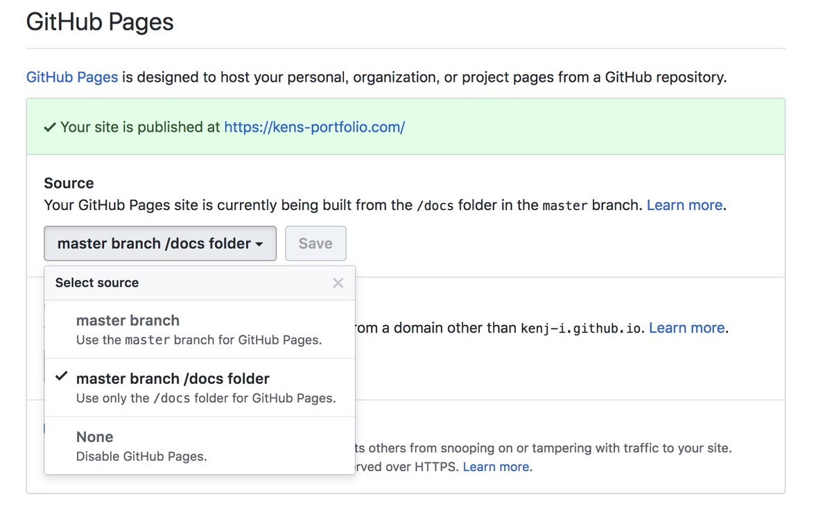 Sourceは公開するためのソースコードの場所を指定します。masterかgh-pagesというブランチのソースコード全体かmasterブランチの/docsディレクトリ以下を公開領域にすることができます。