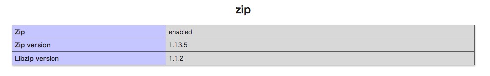 というコマンドを実行するとPHPを動作させる環境に追加されている拡張機能(モジュール)の一覧を確認できます。表示された一覧にzipという記述があれば追加されています。