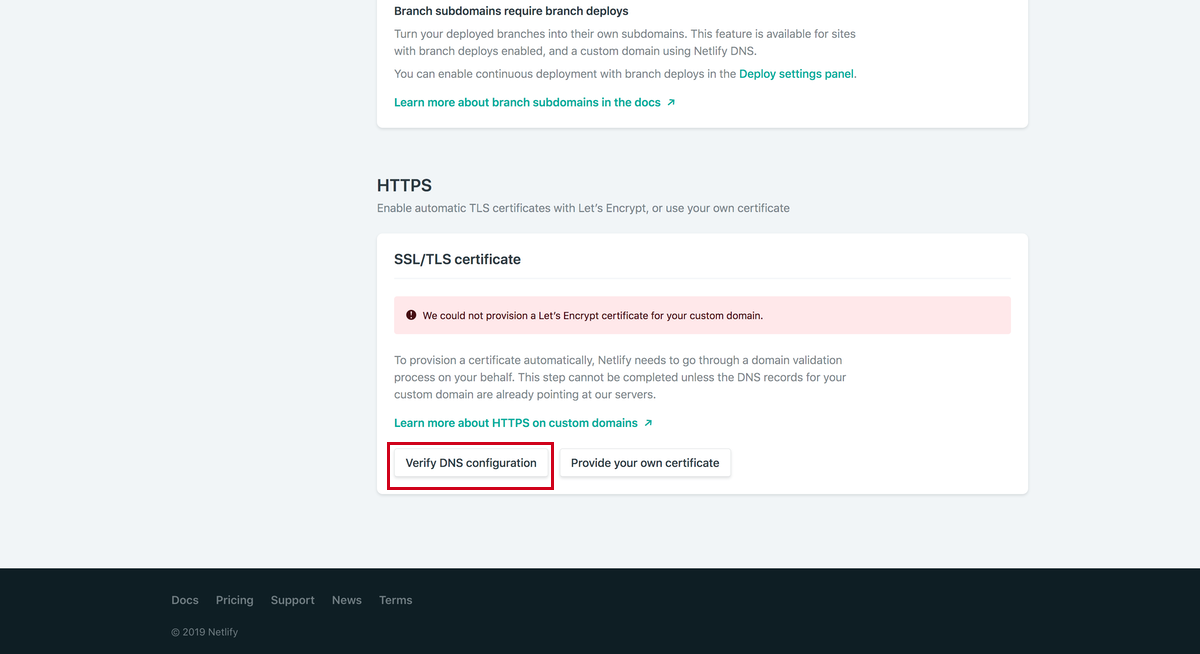 ドメインを追加したら、次にDNSという設定が必要です。Netlifyで使用しますよということをドメイン会社に伝えないといけません。なのでドメインを管理しているサイトでの設定も必要になります。