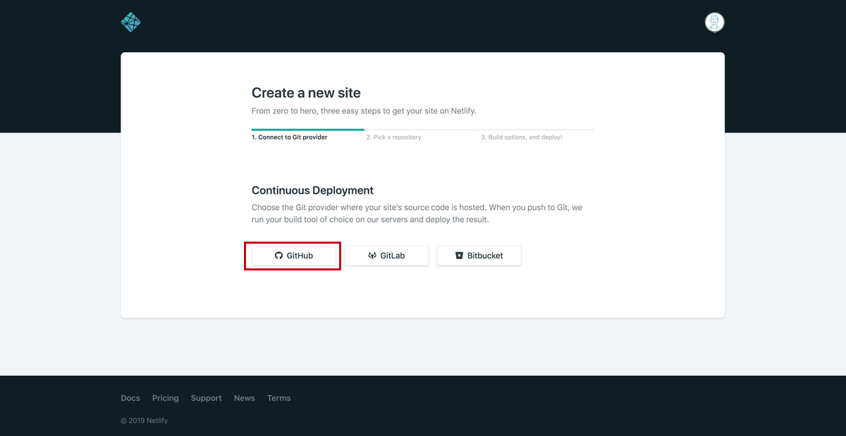 使用するサービスを選びましょう。僕はGithubを選択しました。もしGithubと連携していない場合は認証をして連携しましょう。