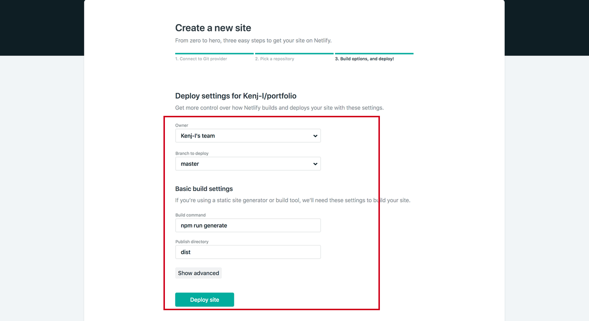 そして、ビルドするコマンドを入力します。僕の場合は、Nuxt.jsを使用していてnpm run generateでビルドができ、distというディレクトリの中にビルドファイルが作成されるのでそれに合わせて入力します。